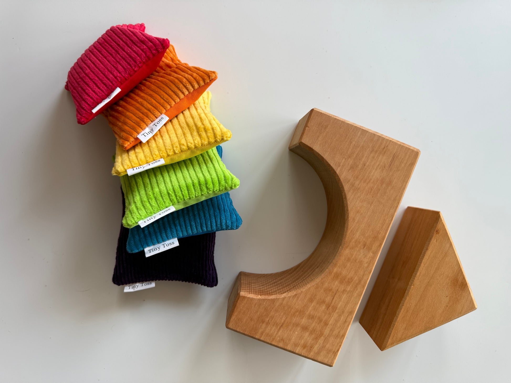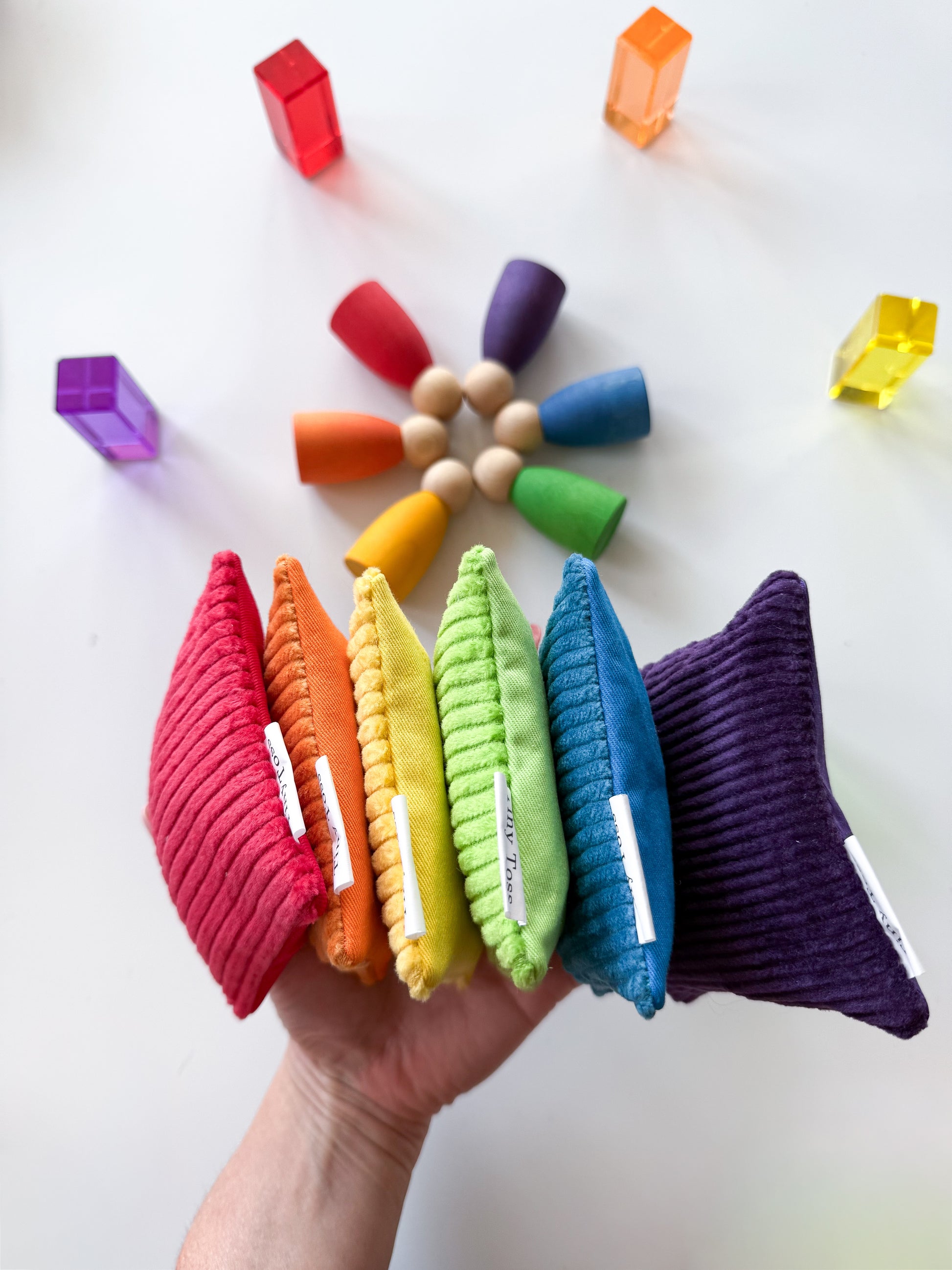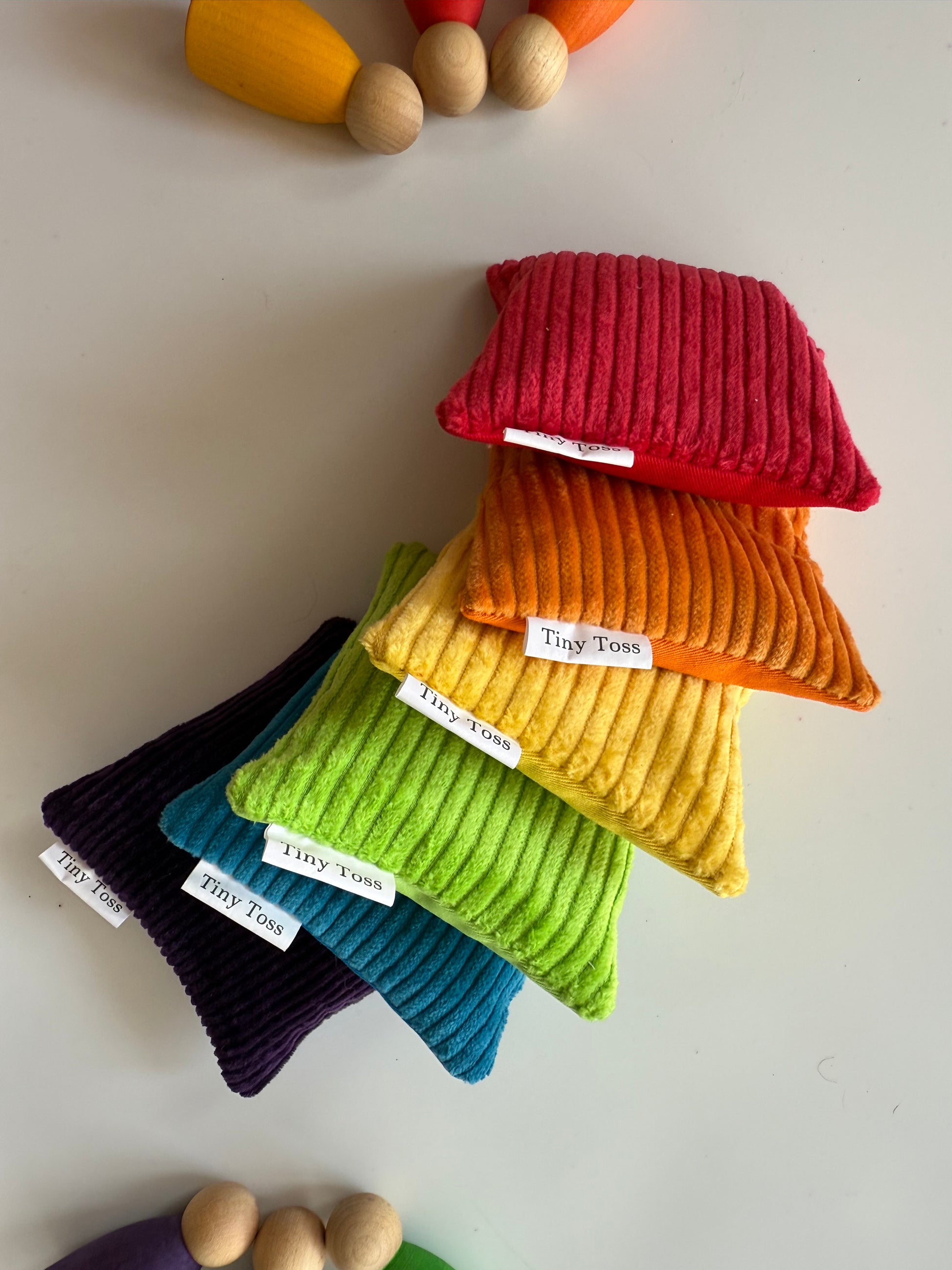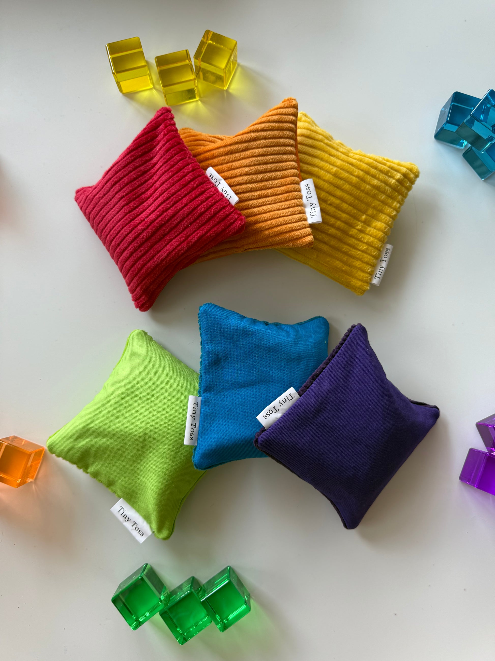 Bright, bold, and bursting with fun – the Tiny Toss Colourburst Set is a vibrant collection of 6 handmade sensory sandbags, each in a stunning rainbow shade. Thoughtfully designed for little hands, these sandbags support open-ended play, motor skill development, and sensory exploration.