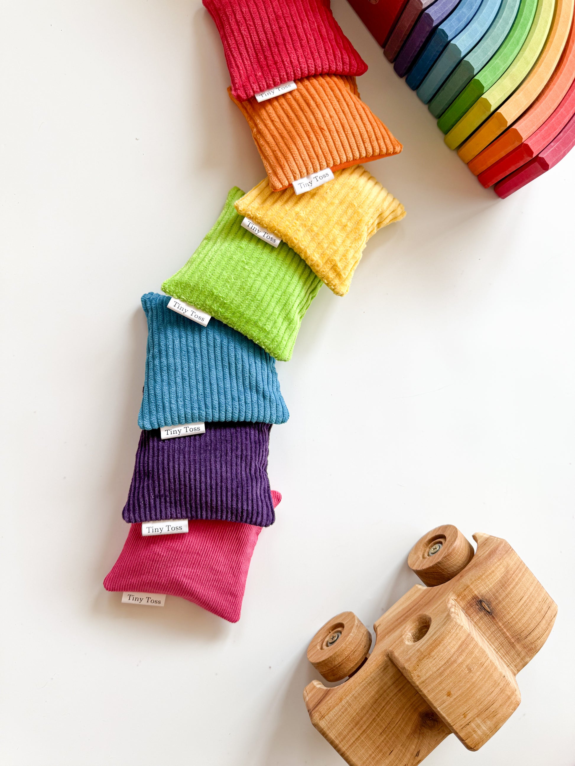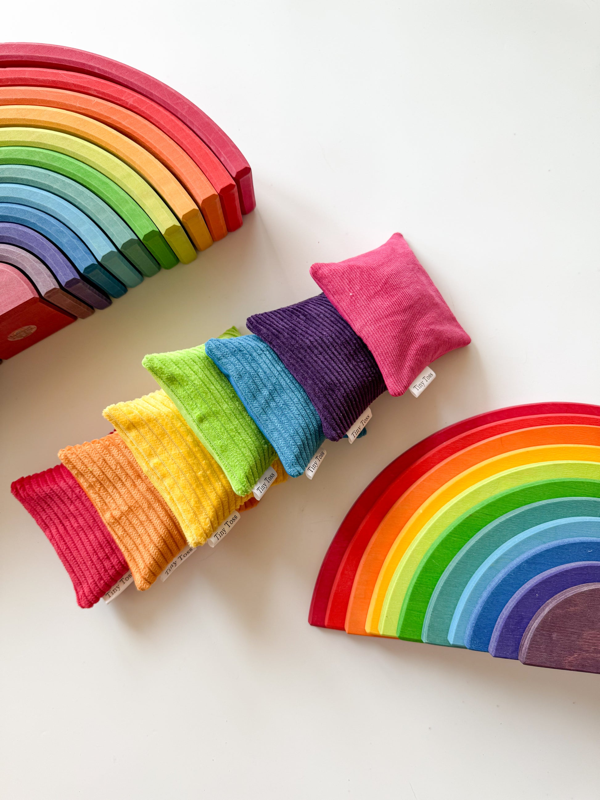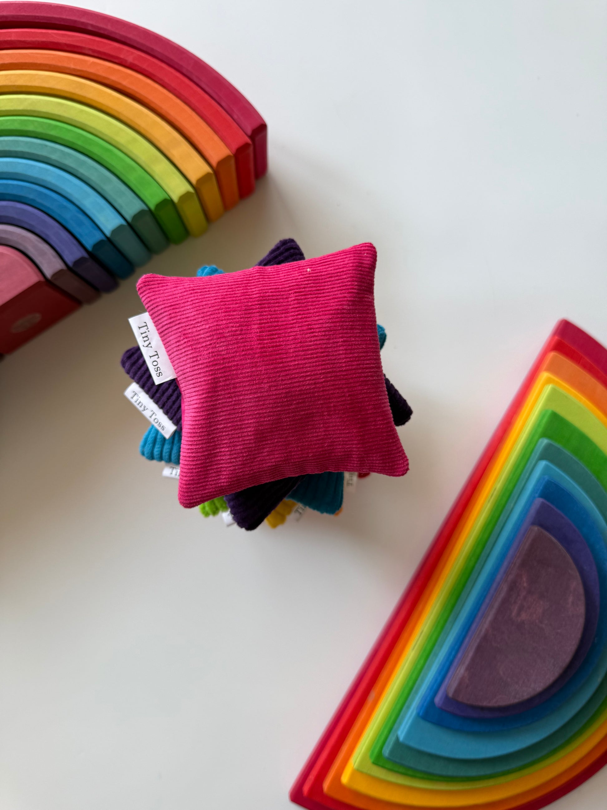 The Pink Burst Sandbag brings an extra layer of brightness to open-ended play — perfect for mixing into rainbow sets, extending colour play, or standing alone as a vibrant feature piece. Handmade in small batches, each sandbag is carefully constructed with a double fabric lining and securely hand-finished for durability and softness in little hands.